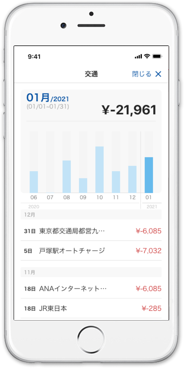 - 登録した口座の利用明細をもとに、自動仕分け、グラフ表示することで収支をかんたんに確認できます。