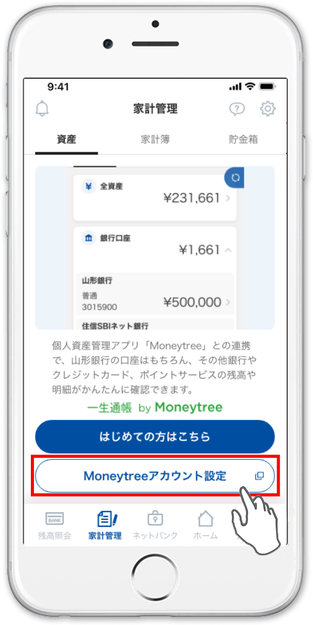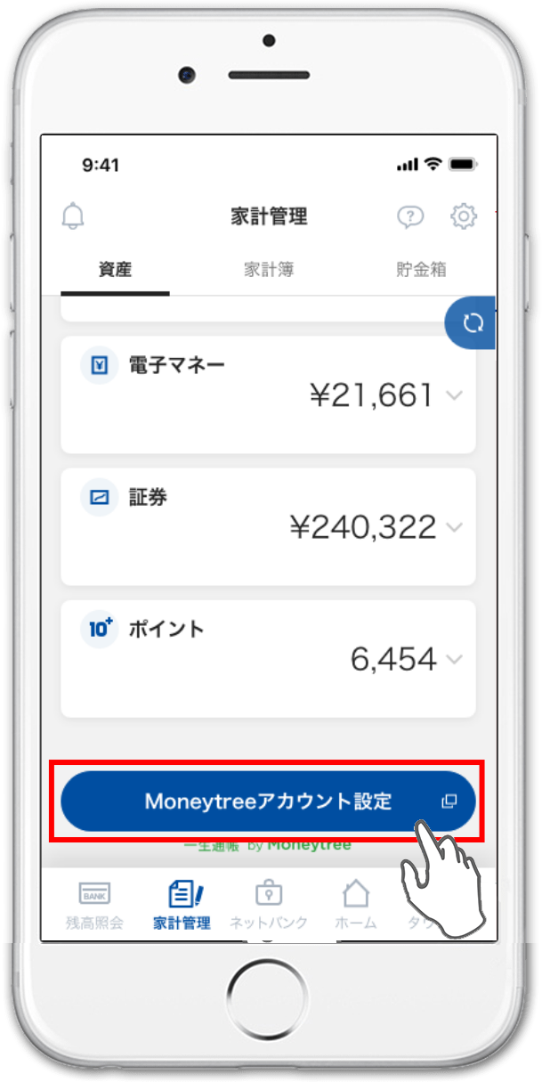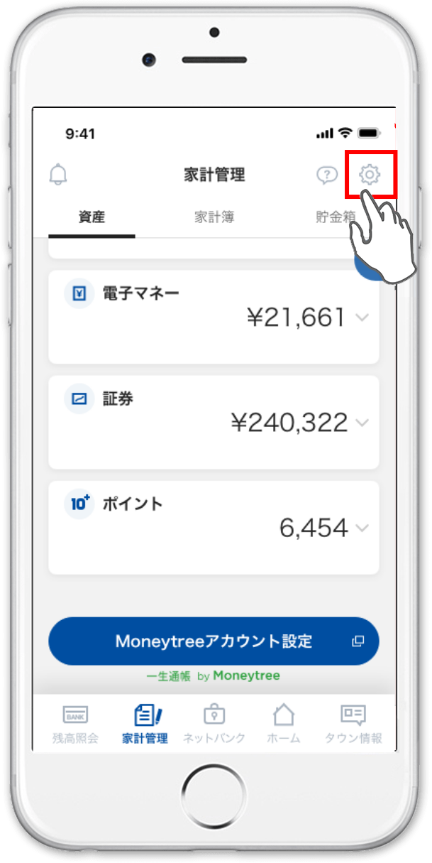 続いて「金融機関の登録方法」の手順に進んでください - 資産画面の「Moneytreeアカウント設定」をタップします。