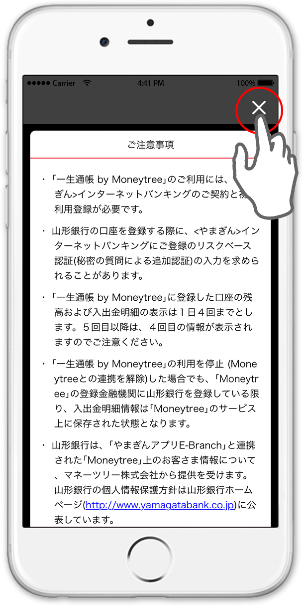 - お知らせメッセージ画面の「はい」をタップしてご注意事項画面へ遷移します。