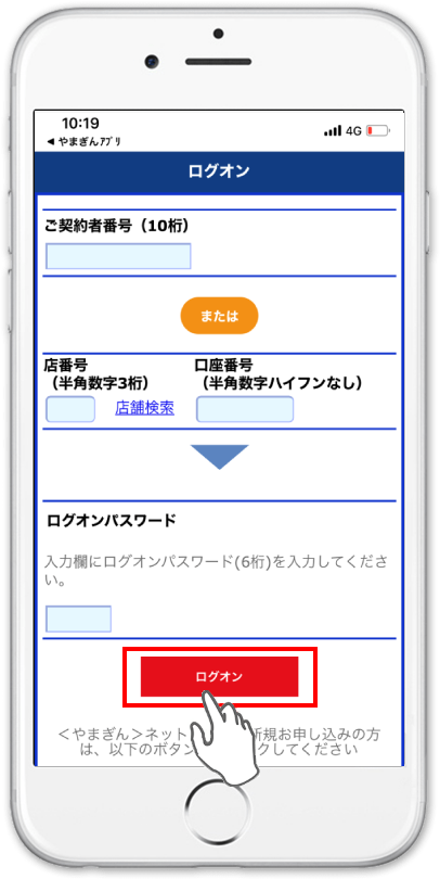 - キャッシュカード到着後、アプリホーム画面より、ネットバンクをタップして、<やまぎん>ネットバンクの契約者情報(代表口座の店番・口座番号またはご契約者番号)、ログオンパスワードをご入力のうえログオンしてください。