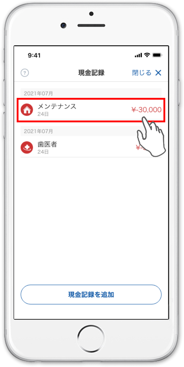- 現金記録一覧画面に登録した現金記録データが表示されます。各データをタップすると現金記録編集画面に遷移します。また、削除したい場合は現金記録編集画面下部の「現金記録を削除」をタップします。