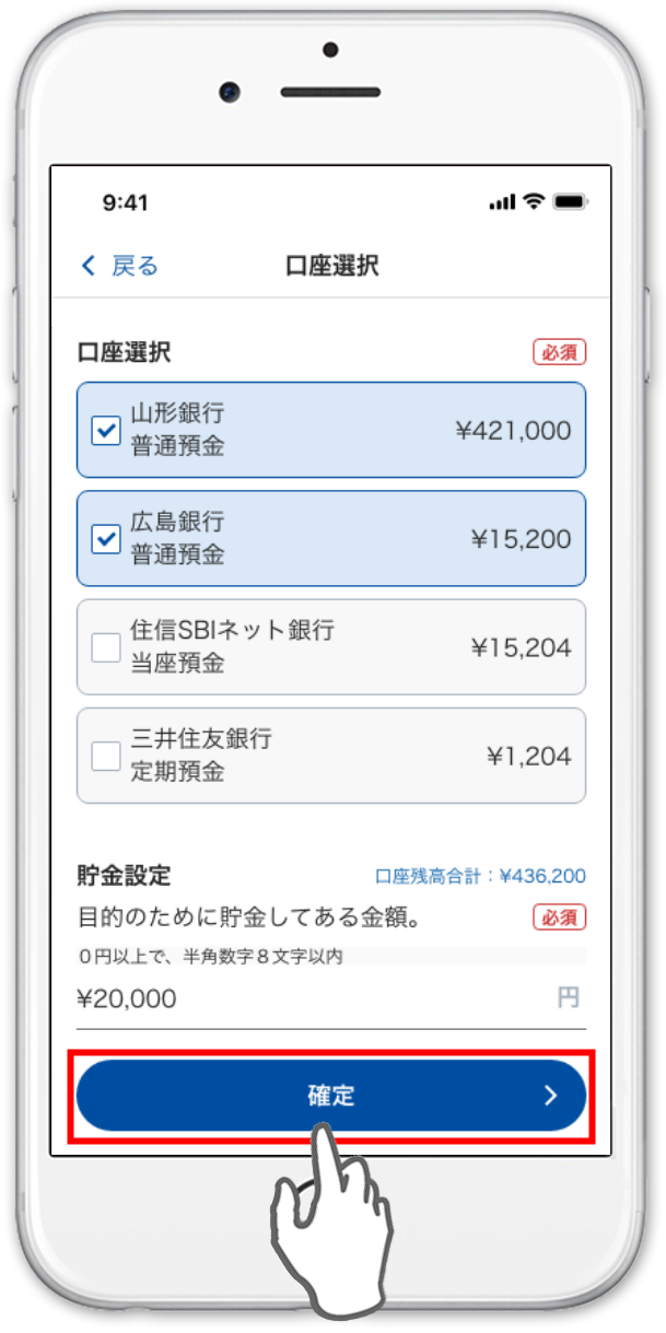 - 貯金目的を設定する銀行口座を選択し、目的のために貯金してある金額を入力して「確定」をタップします。