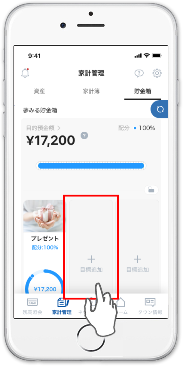 - 家計管理の「貯金箱」画面にて「目標追加」をタップします。