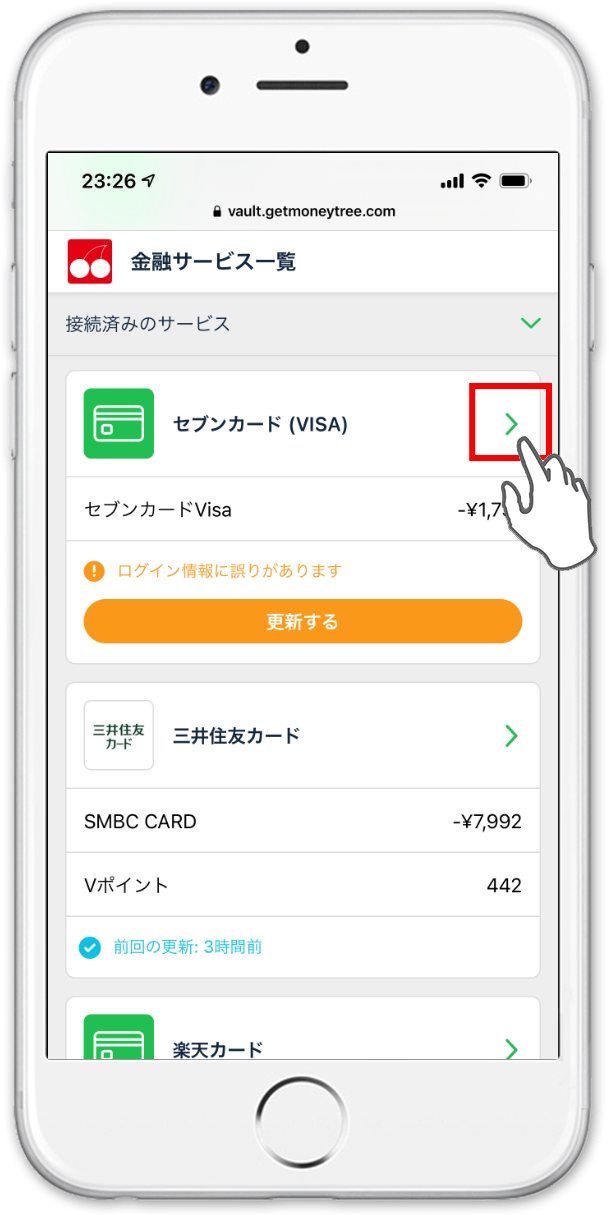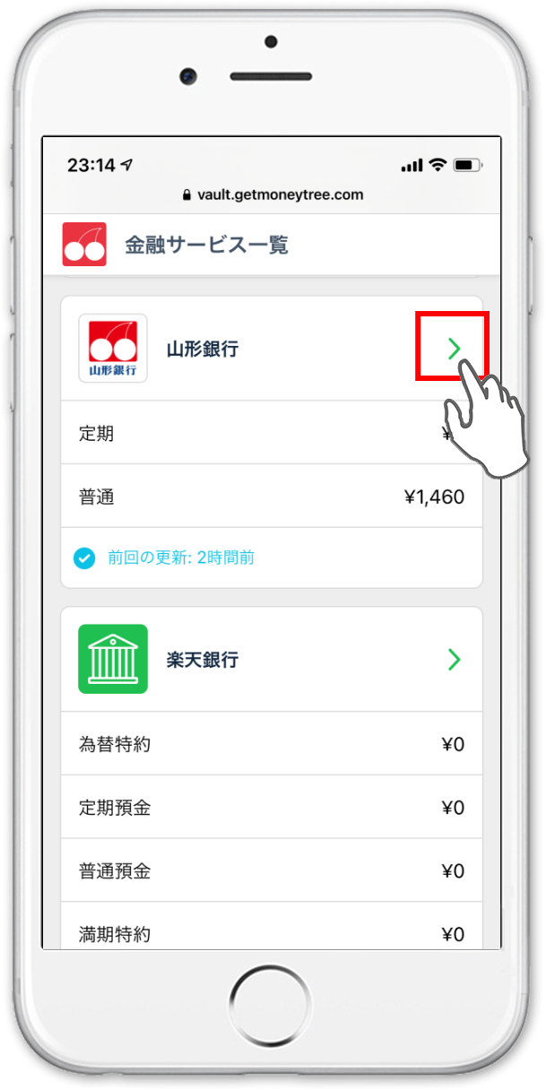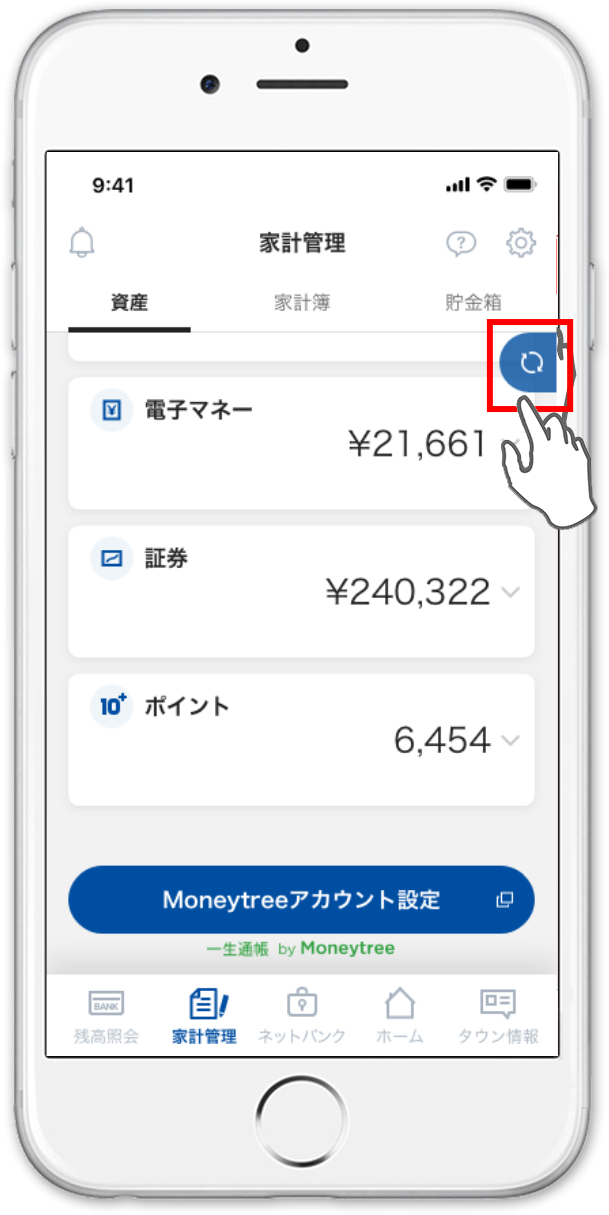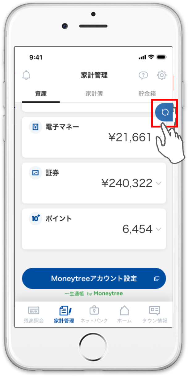 - 家計管理画面の「貯金箱」タブにて、最新のデータを取得できない時、「更新」ボタンを押下すると最新のデータを取得できます。