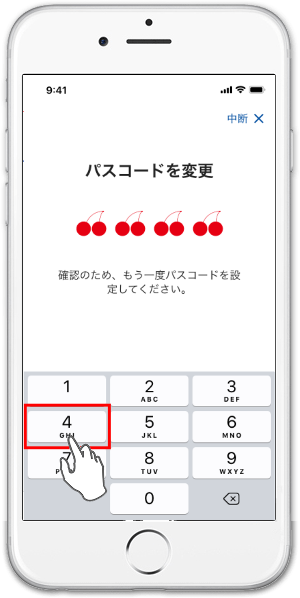 - 「パスコード変更」画面に新しい4桁の数字を入力します。