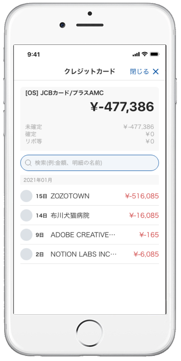 アプリ内の取引明細確認画面で「未確定」「確定」「リボ等」のカテゴリ別に金額をご確認いただくことも可能です。なお、以下のケースでは残高が正しく表示できなくなるケースがございますので、ご理解のほどお願いいたします。- ①リボ払いや分割払いで、支払い時期が未定のもの