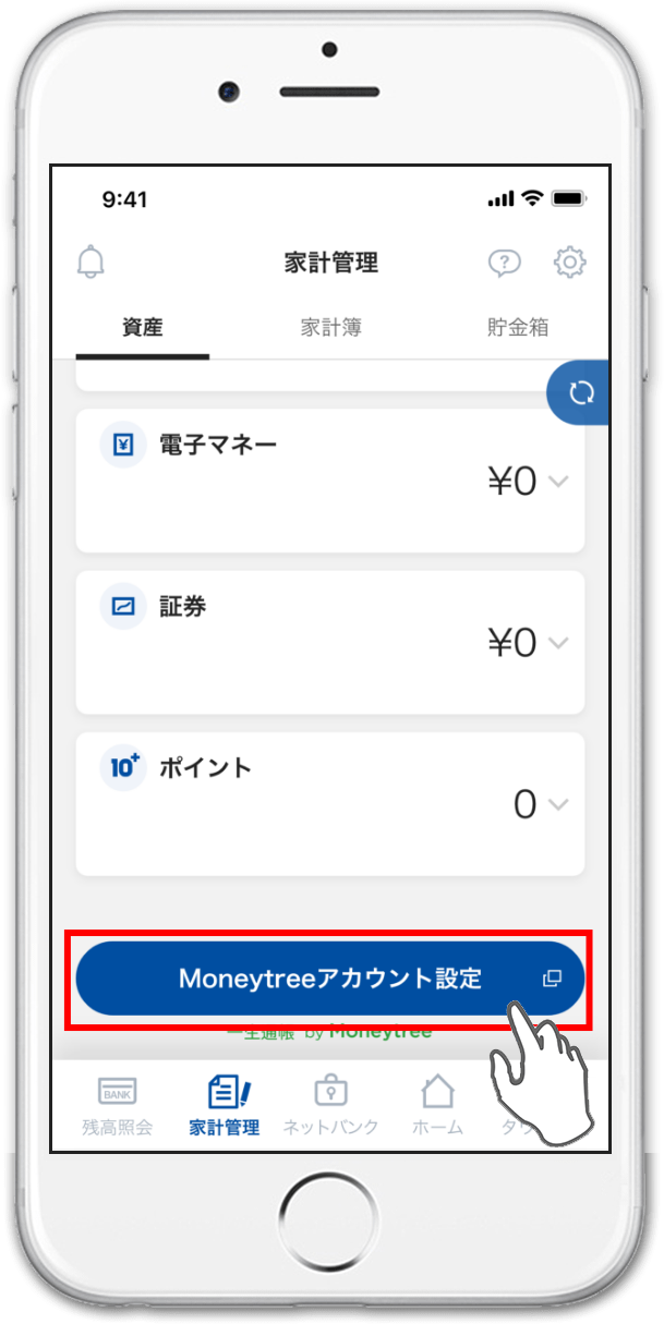 続いて「金融機関の登録方法」の手順に進んでください - 資産画面の「Moneytreeアカウント設定」をタップします。