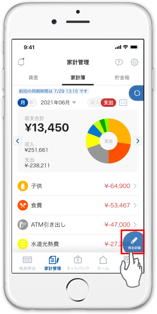 現金記録は『「ATM引き出し」した現金の使い道をカテゴリ区分する』機能で、以下の手順で利用することができます。