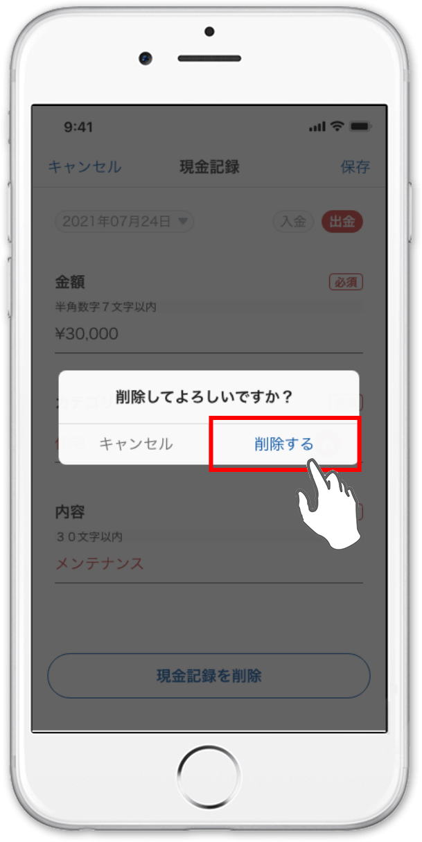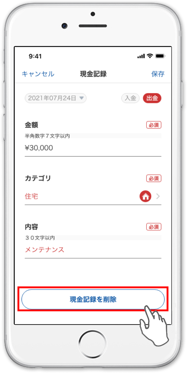 - 現金記録一覧画面に登録した現金記録データが表示されます。各データをタップすると現金記録編集画面に遷移します。また、削除したい場合は現金記録編集画面下部の「現金記録を削除」をタップします。