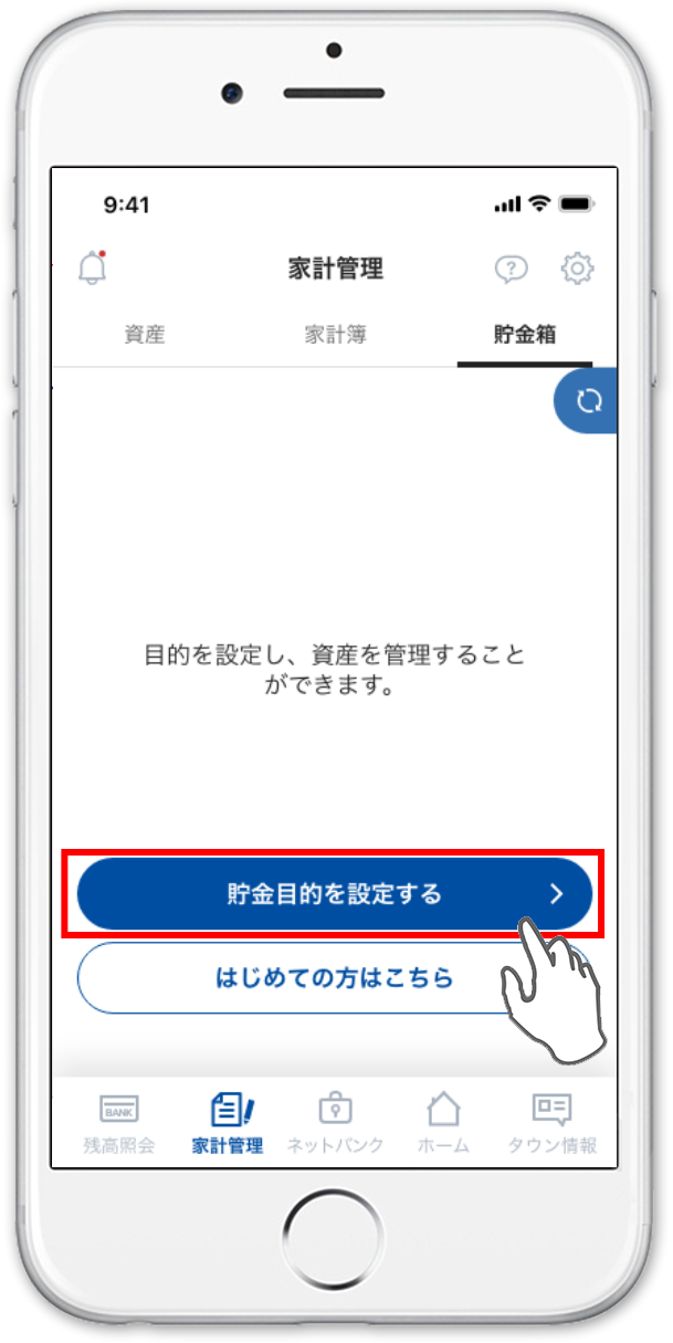 - 家計管理の「貯金箱」画面にて「貯金目的を設定する」をタップします。