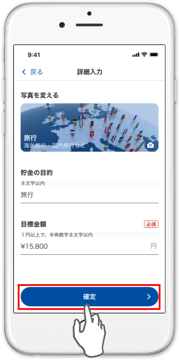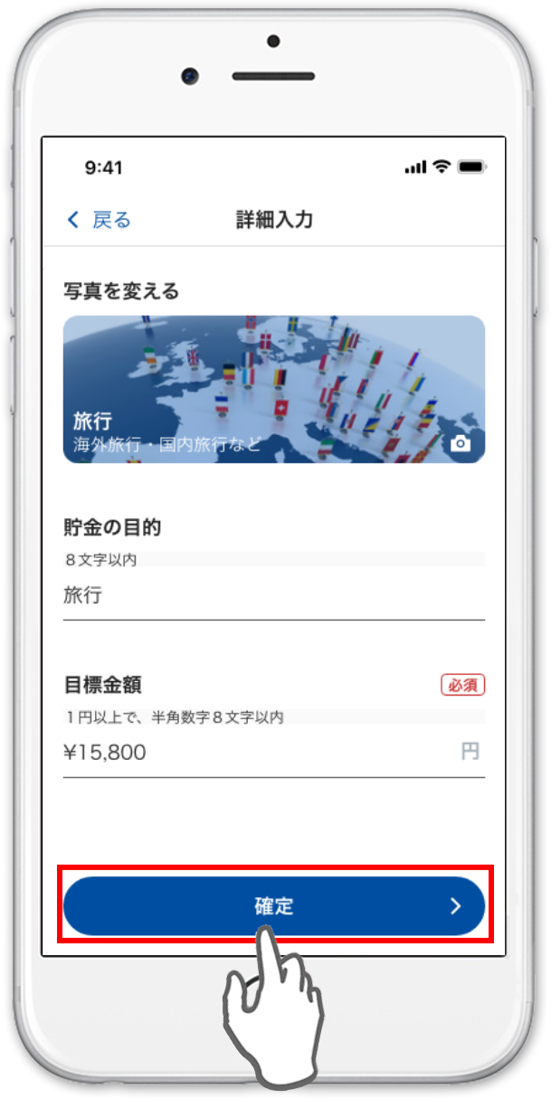 - 貯金目的を設定する銀行口座を変更し、目的のために貯金してある金額を入力して「確定」をタップします。