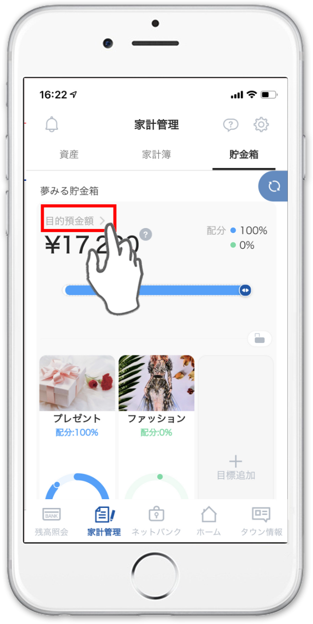 - 家計管理の「貯金箱」画面にて「目的預金額」をタップします。