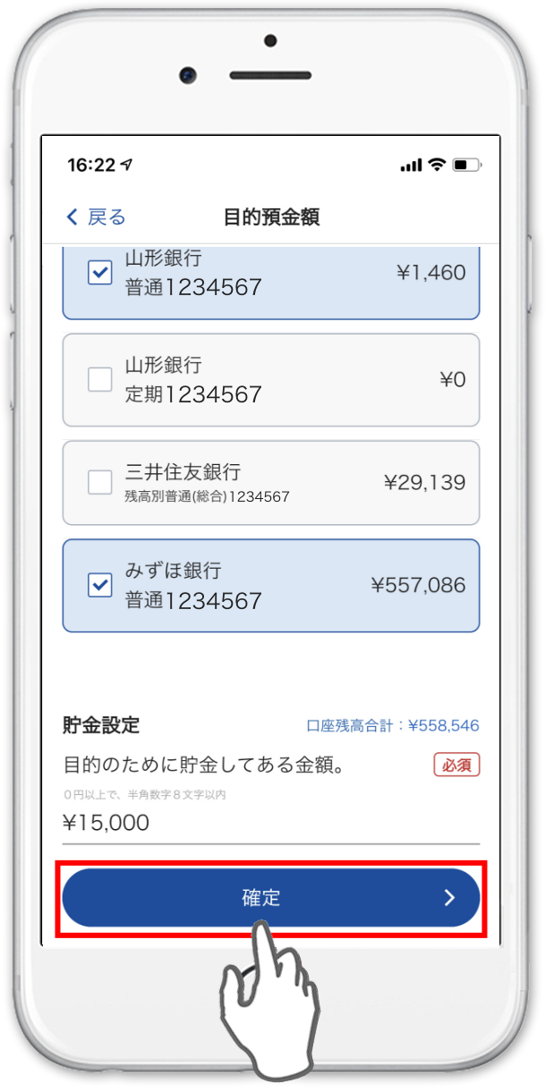 - 貯金目的を設定する銀行口座を選択し、目的のために貯金してある金額を入力して「確定」をタップします。